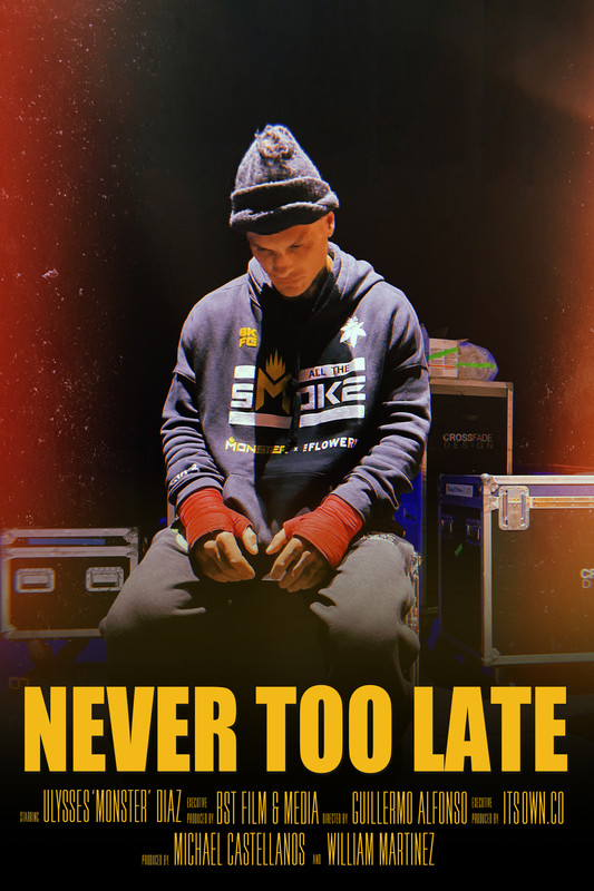 Never Too Late is short biopic about passion and determination. We find ourselves face to face in the ring with Ulysses “The Monster” Diaz as he tells his incredible story of pain and perseverance. Diaz is an accomplished boxer and a bare knuckle fighter most famously known for holding the world’s fastest knock out in sports combat history ( 3 seconds!) made official by Guiness World Records. From prison time to becoming head of security for his child hood best friend Pitbull, Diaz has had one hell of a ride so far that seems to have just started. We join him backstage as director Guillermo Alfonso documents all the intense moments leading up to Diaz’s first title fight at age 40 against legendary MMA fighter Thiago Alves. Trained by boxing Hall Of Famer Commander Zero and accompanied by his fiancé Ashley Sebera aka Dana Brook (WWE superstar Diva), we realize that Diaz has been preparing for this moment his whole life. After hearing his story you will know that no matter what your circumstances are, it’s NEVER TOO LATE.